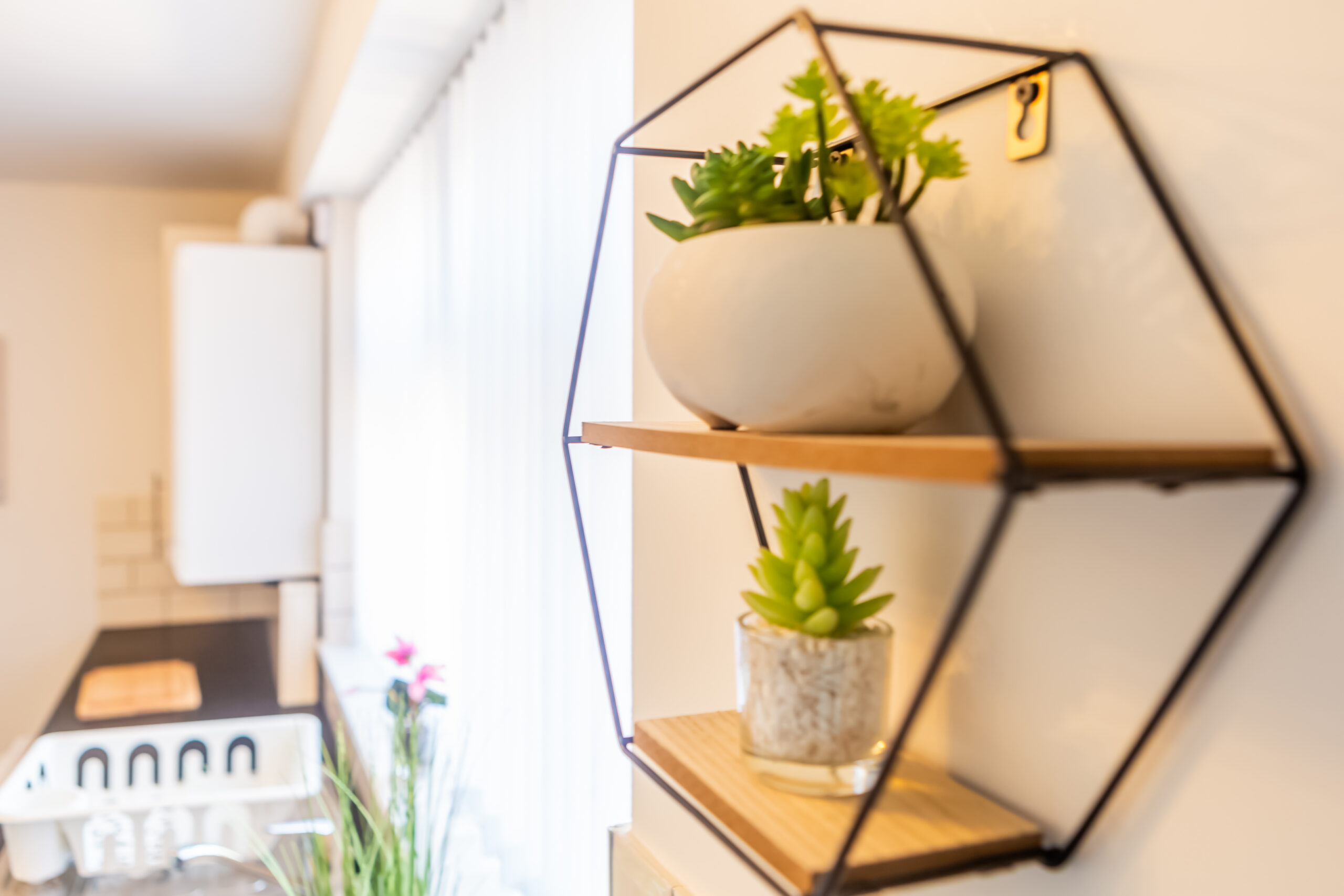 White galley kitchen with black worktops