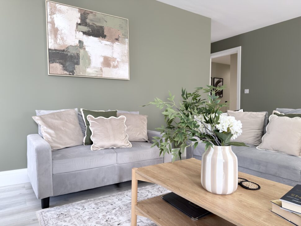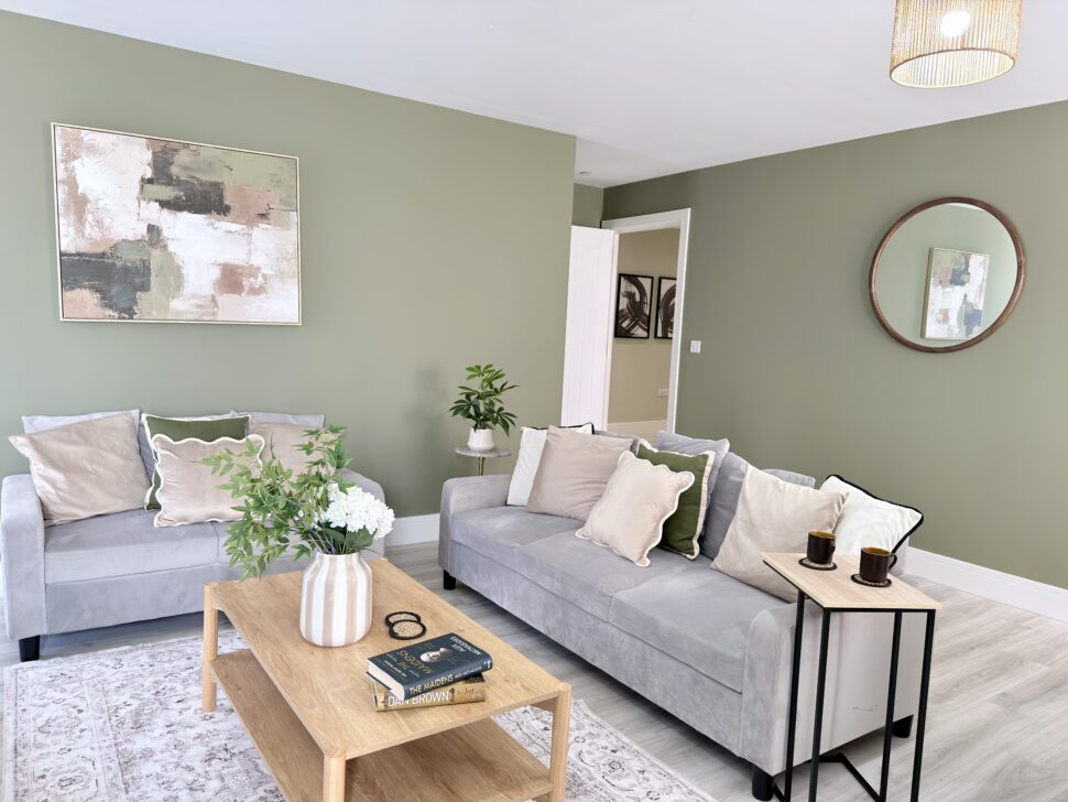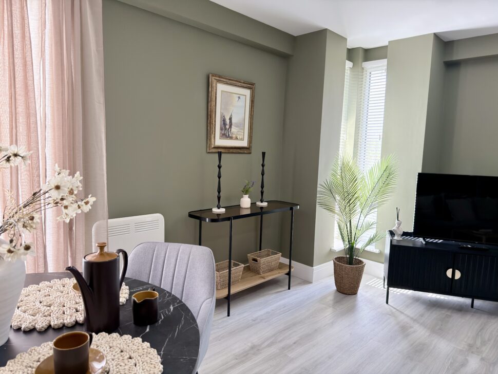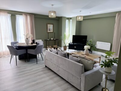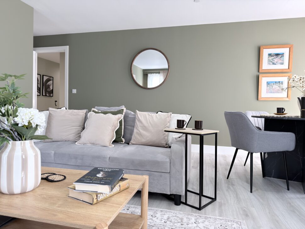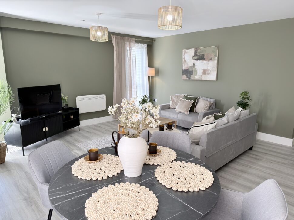 Open-plan lounge and dining area featuring a grey corner sofa, smart TV, coffee table, and dining set for four – offering the largest style apartment within the complex.