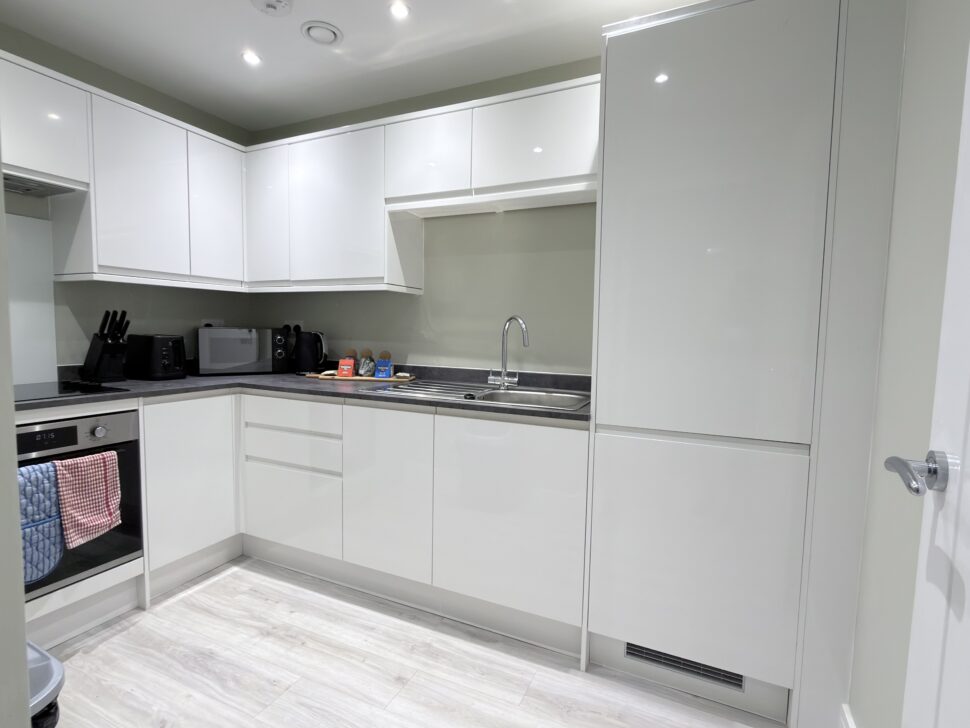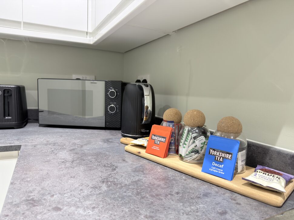 Fully equipped separate kitchen with fridge/freezer, microwave, kettle, toaster, washer/dryer, and clothes airer