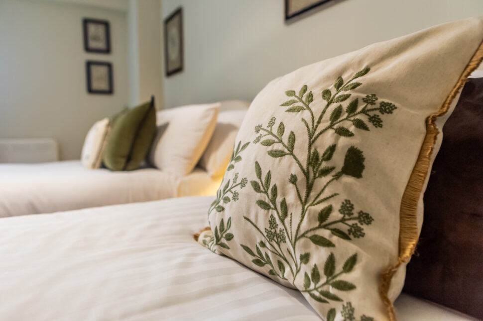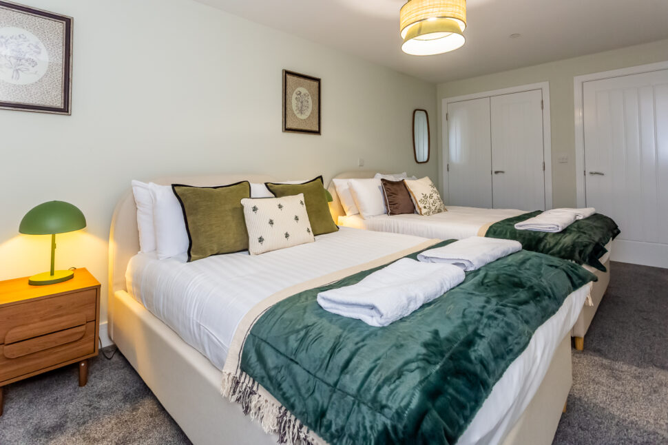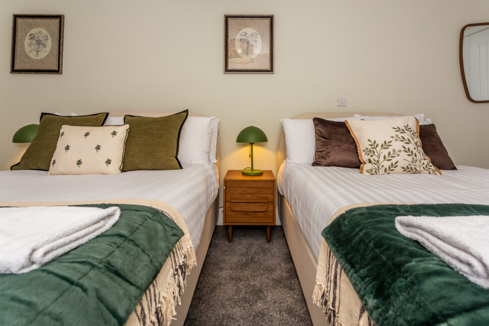 Two thoughtfully designed bedrooms: one with a roomy small double bed, and another with two small double beds – each offering warm décor and generous wardrobe space
