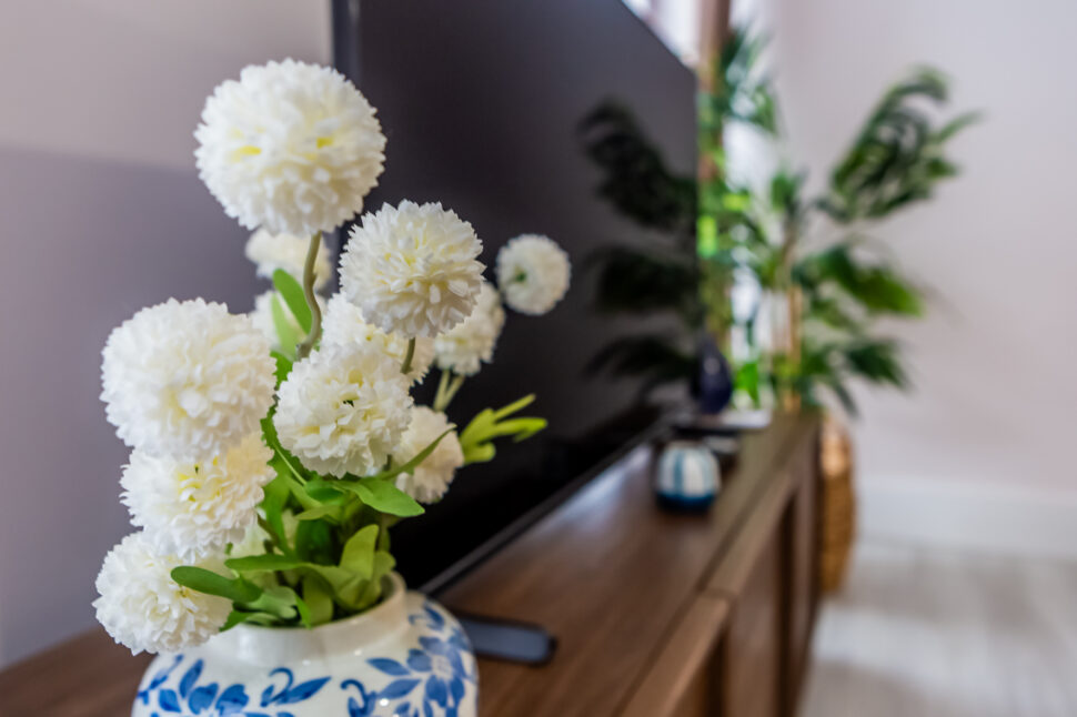 Spacious open‑plan living and dining area with a comfortable sofa and smart TV