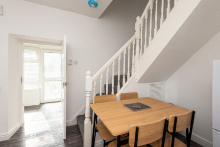 The home features a bright and comfortable living area, a well-equipped kitchen with everything you need for a self-catered stay, and a dining space perfect for relaxed meals or working from home. The two bedrooms are tastefully furnished, offering restful retreats after a day exploring or commuting. The bathroom includes a bath with overhead shower for added convenience.